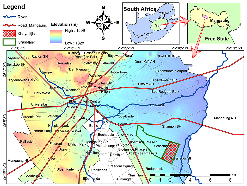 Khayalitjha in-situ informal settlement is geographically located in Bloemfontein city of Mangaung Metropolitan Municipality of the Free State Province, South Africa. Khayalitjha in-situ informal settlement (Figure 1) was chosen because it is located in an urban metropolitan city. People settled in Khayalitjha around 2004 and underwent incremental development for about 2000 surveyed erf/erven (RSA MMM (h), 2021).