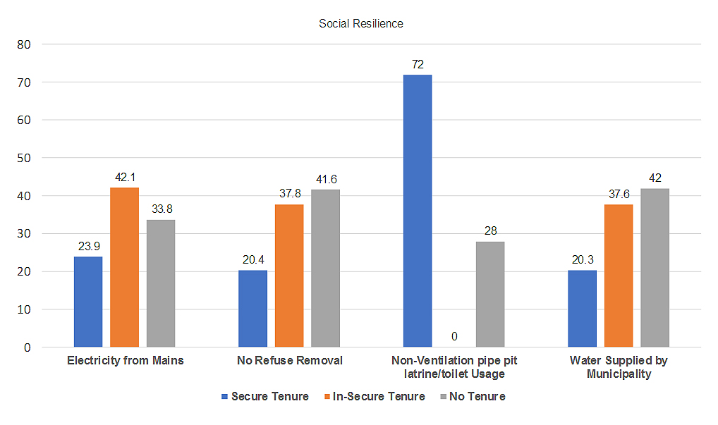 Due to incremental informal settlement upgrading, piped tap water was installed at 2000 serviced stands. The households are not expected to pay for services, property rates, and taxes. Only properties with a market value above R70,000.00, equivalent to US$4666.66 (July 2021) are expected to pay for services. As a result, the insecure tenure and no-tenure households opted for illegal piped water connections for a straight connection fee of R150.00 (US$10 at July 2021). The households used local unregistered plumbers, and a once-off payment for illegal water pipe installation and connection to household taps. An official South African identification document or being legally documented by Home Affairs immigration policies is one of the requirements to be eligible for a serviced plot stand with incremental upgrading. Most informal settlement residents of Khayalitjha are, however, Lesotho Nationals with expired legal documents or low-income urban economic migrants not interested in owning dwelling units. This implies that informal settlement communities should strengthen and intensify the advocacy and publicity campaigns regarding the Breaking New Ground policy and the housing programme options. These findings align with The Socio-Economic Rights Institute of South Africa (SERI), which highlighted that profound inequalities in access to basic municipal household services like clean water, proper sanitation facilities, and electricity characterize South African informal settlements. According to Tun [10] and IIED [12], the increased focus and urgency on urban resilience is owing to urban cities experiencing natural and artificial calamities. These difficulties include people's vulnerability to climate change, growing urbanization, a lack of tenure security, migration to metropolitan areas, inadequate infrastructure, housing, basic social services, and insecurity.