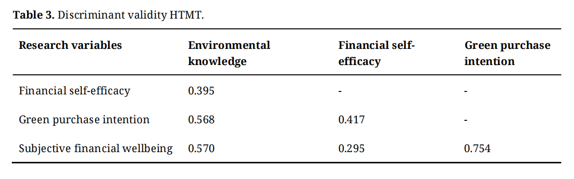 Data AnalysisThe validity and reliability of the questionnaire items were calculated. Regarding reliability, Cronbach’s alpha and composite reliability exceeded the cut-off point of 0.7 [34]. In addition, factor loadings and AVE are above 0.5 (see Table 2) and HTMT values are below 0.8 [86] (see Table 3). The hypotheses testing and validity and reliability were calculated using SMART-PLS as PLS-SEM. Partial least square structural equation modelling was adopted to test the relationships among the research variables as it allows for a simultaneous testing [87] of the impact of environmental knowledge, financial self-efficacy and financial wellbeing on green purchase intention, while taking into consideration the moderating role of age, education level and gender, which helps in achieving the research aim. More specifically, partial least square was adapted to fit the complex research model [88] as it contains more than 5 variables [89] and combines multiple moderation variables [90]. Following Akhtar, Li [91] the bootstrapping technique was used to assess model adequacy, through calculating the SRMR and NFI model fit indices, in addition, R2 and R2 adjusted were also illustrated to support the goodness fit of the model. The output illustrated the value of 0.058 for SRMR and the value of 0.841 for NFI, which indicate an acceptable model fit. In addition, R2 and R2 adjusted recorded a value of 0.611 and 0.601 respectively, which also indicate a good model fit [92].