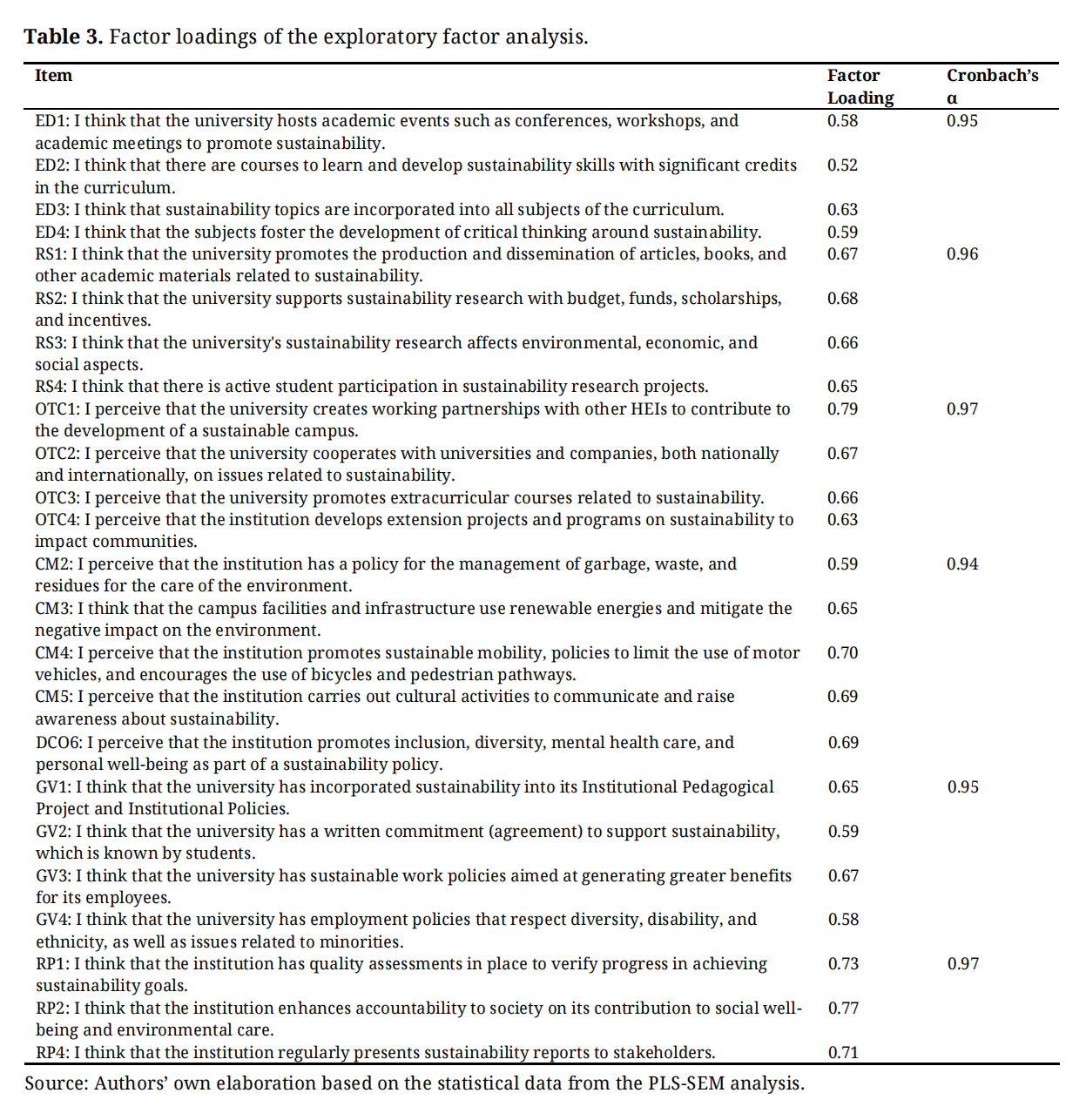 The analysis was thus performed using principal axis factoring and Promax rotation, as these are proper estimation methods for reflective measurement models [98] Moreover, dimensions with factor loadings greater than 0.5 were extracted, guaranteeing meaningful groupings of variables. Only items CM1 and RP3 did not meet the established minimum threshold and were therefore eliminated. Reliability analysis used Cronbach’s Alpha to assess the robustness and consistency of the measurement instrument, with most cases showing values above 0.90 (see Table 3).
