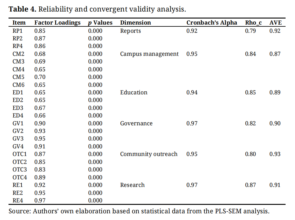 Limitations, Recommendations for Future Work, Theoretical and Managerial ImplicationsThe limitations of this study lie in its focus on the student perspective within the Colombian context. Thus, future research could address other stakeholders and conduct comparative multigroup studies, expanding the scope of investigations to foreign HEIs. While results contribute valuable insights into sustainability performance and student perceptions within Colombian accredited universities, they should be interpreted within this national context. Nevertheless, findings provide a useful reference for similar institutions across Latin America that look to strengthen their sustainability governance and reputation management. Therefore, the main theoretical implications of this study are helping research on university sustainability by providing evidence of the dimensions that could be confirmed in the sustainability management at HEIs. It also contributes to studies that seek to involve students as a central axis of the university mission. Regarding managerial implications, it is a tool that could support planning processes and accountability before various institutions of society and the State.