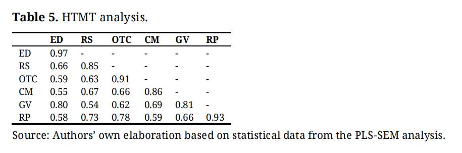 For discriminant validity, the Heterotrait-Monotrait (HTMT) ratio was used to verify that the items do not measure the same construct. The analysis addresses cases in which the correlations between indicators measuring the same construct are higher than the correlations between indicators measuring different constructs, with values strictly below 0.85 or acceptably below 0.90, and confidence intervals lower than 1 [100]. Consequently, confidence intervals for the HTMT are below the 0.90 threshold in all cases (see Table 5), which corroborates the discriminant validity of the model.