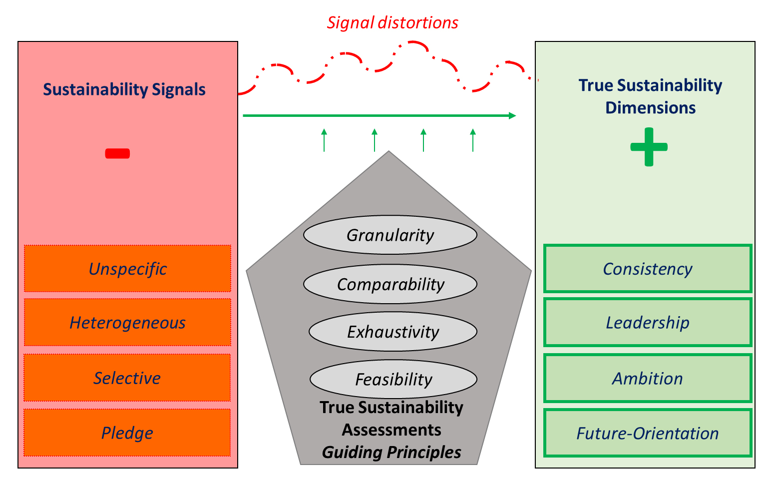 The pervasive heterogeneity across sustainability reports [12] difficults to compare performance across companies, which complicates the assessment of leadership in true sustainability. This challenge, known as signal noise [40,41], arises when reported signals fail to capture key unobservable attributes [34], potentially leading to misjudgments in true sustainability appraisals [42]. Our framework seeks to provide homogeneous assessments that enable comparisons across firms. Since true sustainability operates on a continuum, with varying degrees of progress [4,9], relative improvements become a relevant benchmark [43]. We argue that relative assessments to industry peers are needed to minimize signal noise and effectively evaluate leadership in true sustainability. Accordingly, we incorporate the principle of interfirm comparability into our framework.