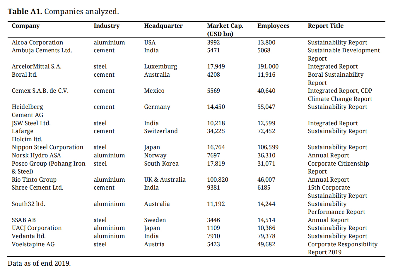 Our 18-company sample is evenly distributed across cement, steel, and aluminium industries and geographically diverse, with one-third (n = 6) headquartered in Europe, 28% in South Asia (India) (n = 5), 16.6% in East Asia (Japan and South Korea) (n = 3), 16.6% in Australia (n = 3), and 5.5% in North America (n = 1). By including only listed companies, the sample lacks representative Chinese companies where non-financial information is often unavailable. Nonetheless, the sample represents global best-in-class basic material companies, ranging from smaller players with 5000–15,000 employees to global conglomerates with more than 100,000 employees (see Appendix A).