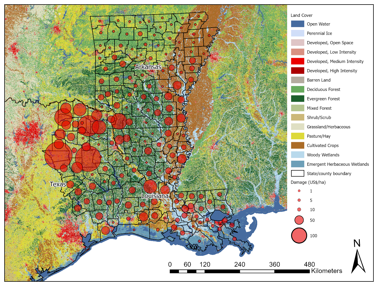 Finally, WTP may be related to the feral swine-induced damage that landowners have experienced. The damage is often associated with land use type that represents the geographic distribution of major crops, livestock, and forest products, as well as natural ecosystems [1,2]. Thus, we also attempt to map the elicited WTP values in relation to land use at the county level by utilizing the National Land Cover Database (NLCD) [33] and the National Boundary Dataset (NBD) [34] from the U.S. Geological Survey (USGS). This also allows us to analyze potential variations in WTP across geographic areas.