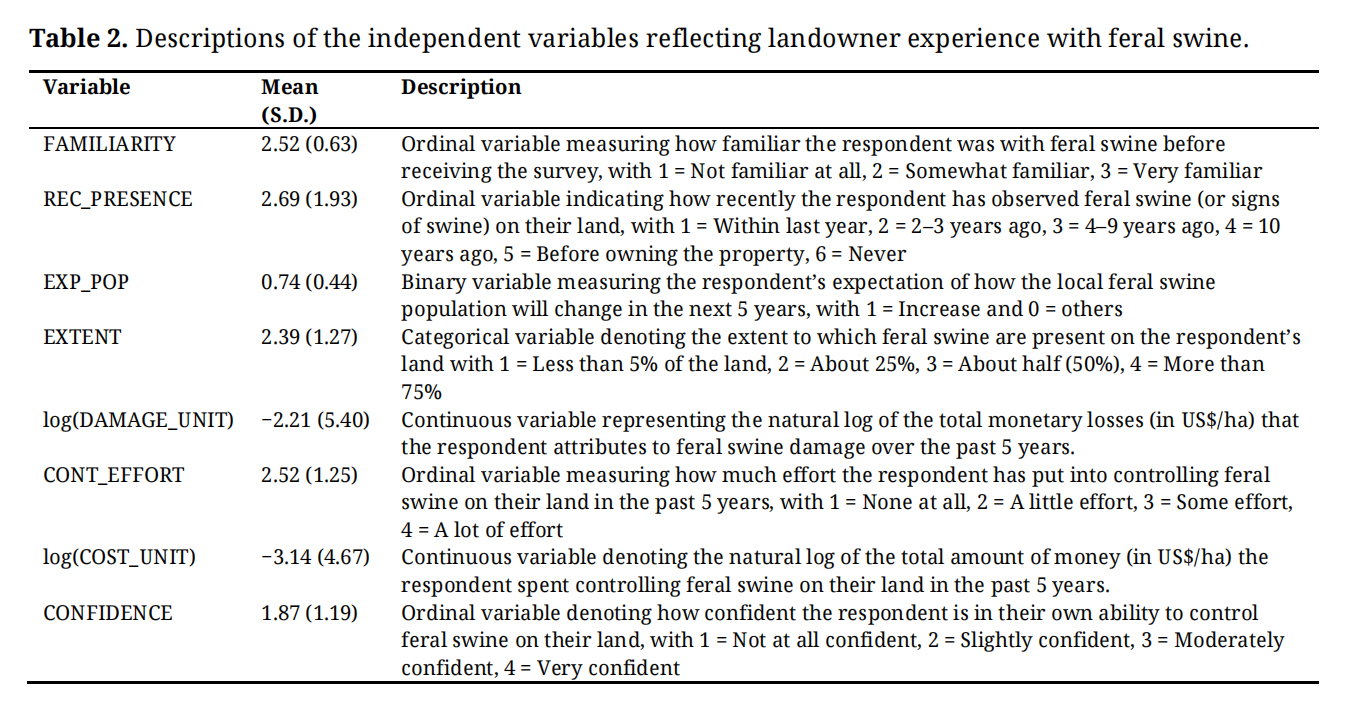 Building on these insights, this study has three objectives. First, we quantify the monetary value that private landowners are willing to contribute to feral swine control programs. Second, we examine how swine-related damages and the corresponding WTP change across different land uses, including cropland, pasture, and forestland. Finally, we use a two-part hurdle model to investigate how WTP is influenced by demographics (e.g., age, gender, income, education), land and ownership characteristics (e.g., land size, tenure, type), landowners’ perspectives (e.g., feral swine’s environmental influence, perceived program effectiveness), experiences (e.g., familiarity, personal experience with the damage) and attitudes (e.g., trust toward neighbors, activeness in community involvement).