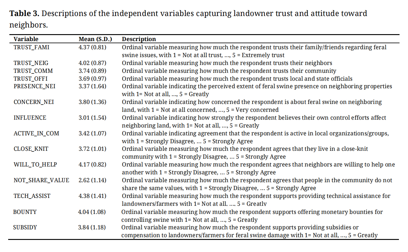 (2) Experience and trust with neighbors: For landowner experience, how recently swine were present on the property (REC_PRESENCE) was the only significant factor, negatively associated with landowners’ willingness to participate. Among the variables of landowner trust toward neighbors, lower trust in the community (TRUST_COMM) and a preference to cooperate with neighbors (COOPERATE) were significantly related to their WTP.