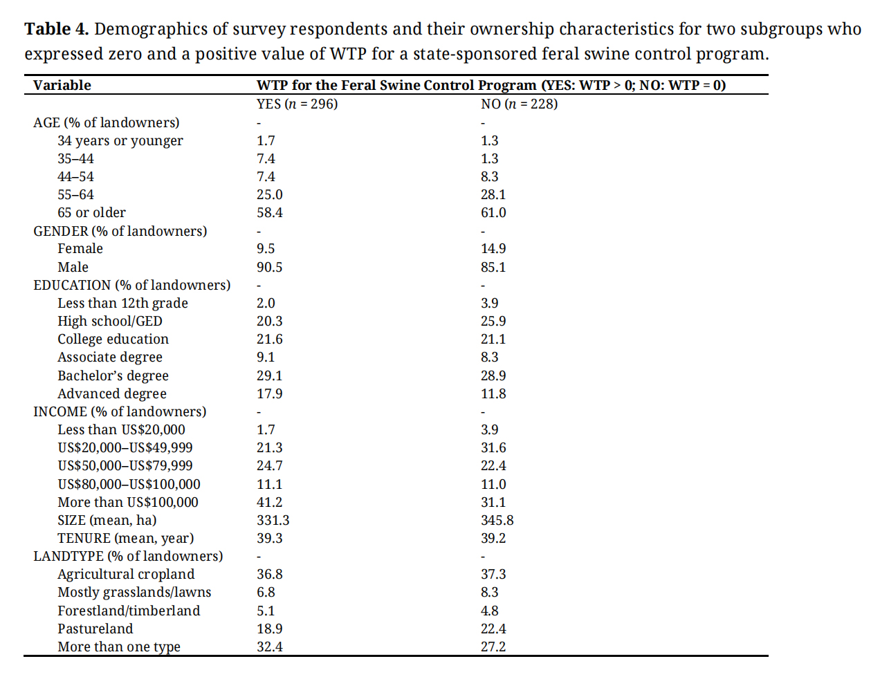 Econometric ModellingWe employed econometric analysis to examine the determinants of landowners’ WTP for a feral swine management and control program. Following the theoretical framework on collective action and planned behavior [35–39] and previous studies in a similar field [45–47], we specified WTP as a function of several key factors. Also, we utilized previously compiled datasets on landowners’ attitudes and perceptions toward feral swine control [1,15]. In our framework, WTP was modelled as a function of landowner demographics (age, gender, education, and income), land and ownership characteristics (acreage, tenure, and land type), experience with feral swine (frequency of sightings and perceived damage), activities to control feral swine, and attitudes toward feral swine control in neighboring lands.