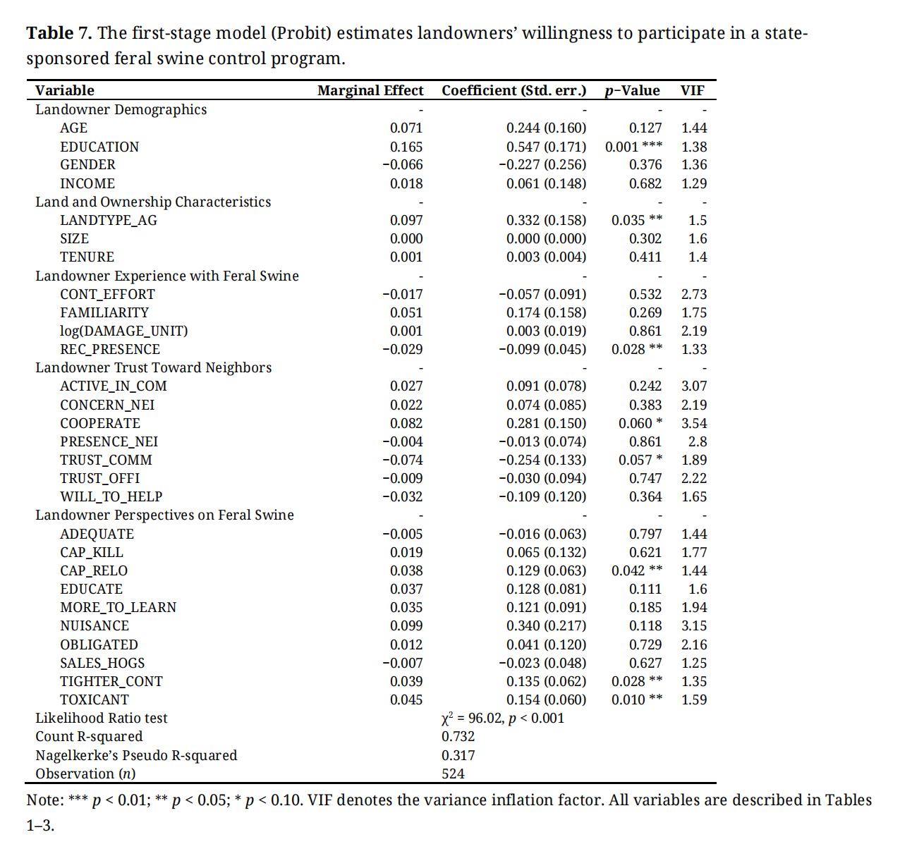 (3) Attitudes toward swine: Regarding landowner perspectives on feral swine control, several variables were related to their willingness to participate. Support for tighter control regulations (TIGHTER_CONT), support for capture and relocation (CAP_RELO), and support for using toxicants (TOXICANT) were significantly related to landowners’ likelihood of participation.