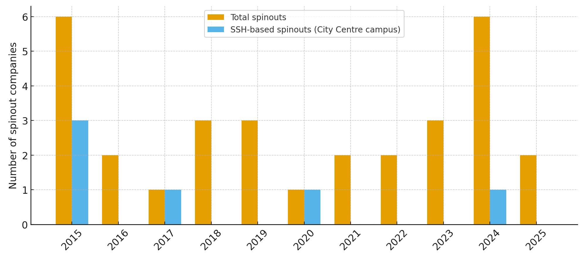 These systemic dynamics are reflected in UH’s commercialisation pipeline. According to HIS reports, the university created 31 spinout companies between 2015 and 2025 in which it holds an equity stake, typically investing €10,000–50,000 at an early stage [17]. Of these, only six originate from the SSH, with the case venture representing the first and only spinout to emerge from the Faculty of Social Sciences during this period (Figure 2). The broader innovation pipeline shows a similar imbalance: between 2013 and 2025, the university recorded 1225 invention disclosures, of which only 5.1% (63) came from SSH faculties [17]. The case venture accounted for 13 of these disclosures. Because non-proprietary social-science innovations rarely meet patentability criteria, the standard invention-disclosure–patent pipeline systematically limits their visibility and support within university commercialisation processes.