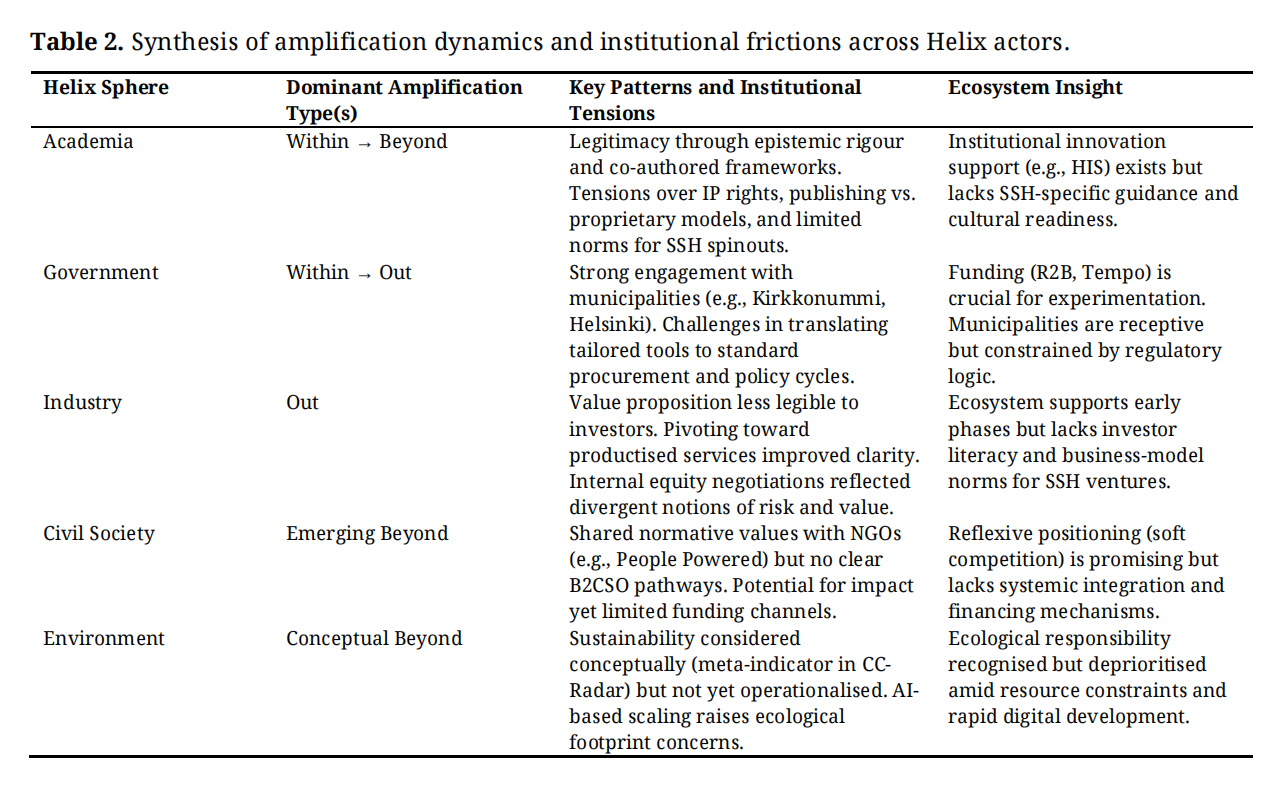 This dual framing highlights the adaptive work required when a venture builds internal capacity while engaging diverse societal domains. It also clarifies the structural tensions we describe as spinout dissonance: the misalignment between normative ambitions and innovation infrastructures optimised for proprietary or technology-centred pathways. In the case of SSH-based ventures, this dissonance is particularly pronounced at the interface between academic knowledge production and market-oriented innovation systems, where non-proprietary, interpretive forms of value encounter infrastructures optimised for scalable, commodified outputs. Seen together, the two lenses show how reflexive entrepreneurship can generate institutional learning within sustainability-governance ecosystems. Table 1 specifies how these intersections manifest across helix domains, identifying where amplification processes encounter helix-specific expectations, and where spinout dissonance and ecosystem learning are most likely to emerge.