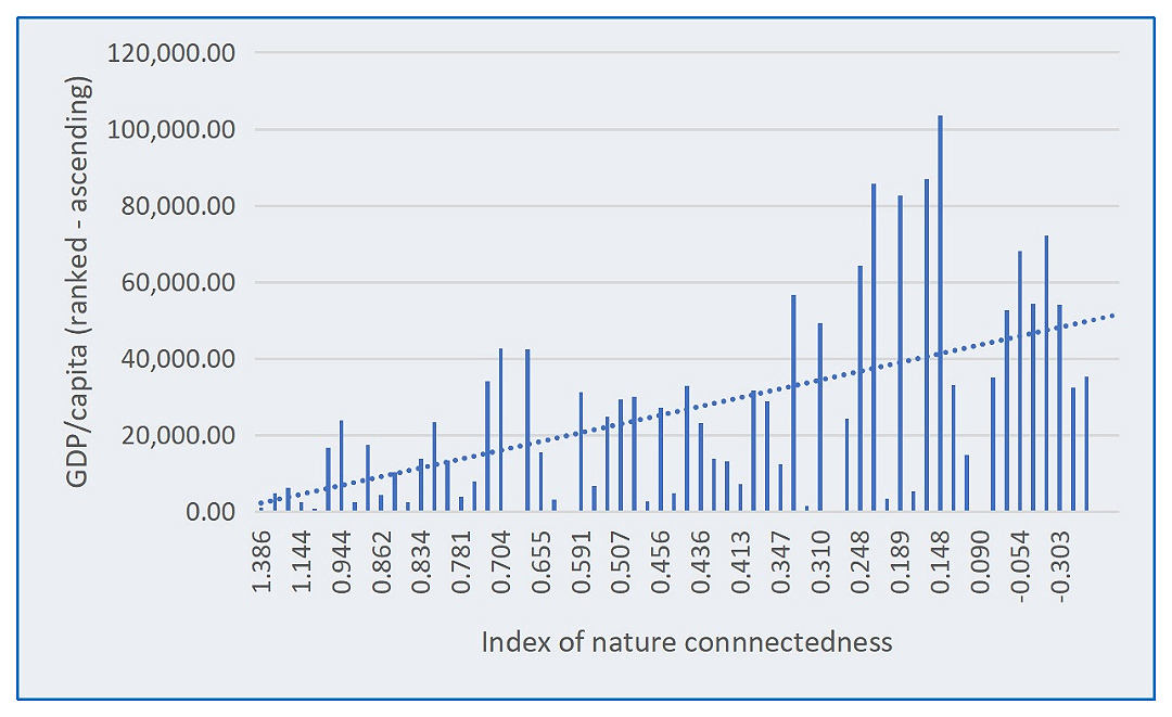 Hence, to confirm the inverse proportionality of high environmental protection (aka resistance) and lower economic growth also advocated by Eckersley (2000) [85] one cross-observed furthermore the results of the IoNC against the World Bank Open Data for one macroeconomic indicator (i.e., GDP per capita)—see Appendices Table A2 and Figure A1. The correlation of the index scores of nature connectedness with GDP, confirmed a negative function, with the focal country (Nepal) appearing precisely at the top of such ranking (1st place out of 61 countries) but almost at the bottom of the used economic indicator, uncovering a clear unbalance of environment protection and economic growth in their SES.