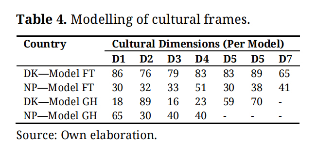 From the data wrapper of these figures, one was able to build four (4) models (vide Table 4), two (2) for Denmark (DK) and two (2) for Nepal as illustrated below, comprised of a representation of two models of the 6D cultural scores of GH and two of FT, as follows: