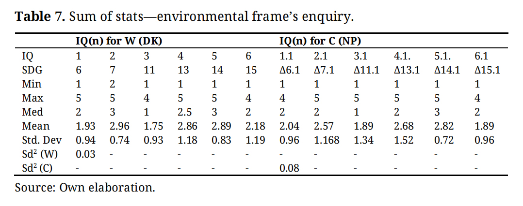 In the table above, the code “IQ1_W_SDG6” stands for the IQ number one, about the First World’s view in the Global North, as per SDG6, while the code IQ1.1_C_SDG6 stands for a variation of the same question one (numbered then 1.1) but then question is slightly altered in formulation to enquire about the respondent’s own country (NP). An identical procedure follows the remaining questions. A Likert scale of five (5) points followed a transitivity principle of lowest (1) to highest (5) using a unit of measurement of agreement, with the following results (Table 7):
