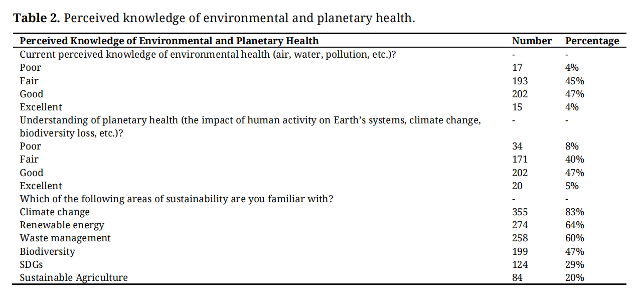Potential consequences of limited knowledge of planetary health and sustainability: The limited understanding of concepts such as planetary health, which connects environmental changes to human health, among healthcare students, is concerning. For this reason, educational curricula that integrate sustainability with public health and healthcare practices are required. Similar gaps were observed among health sciences students in Ethiopia, as previously mentioned. This finding was particularly common among medical and pharmacy students, who mentioned the inadequate coverage of sustainability in the curricula and dependence on mass media for information on the topic as potential reasons [15]. A Malaysian study similarly reported high levels of awareness of the SDGs among university students, with a positive correlation between knowledge and practice (r = 0.4). However, the authors emphasized that global agendas, instead of curricular integration, may influence such awareness.