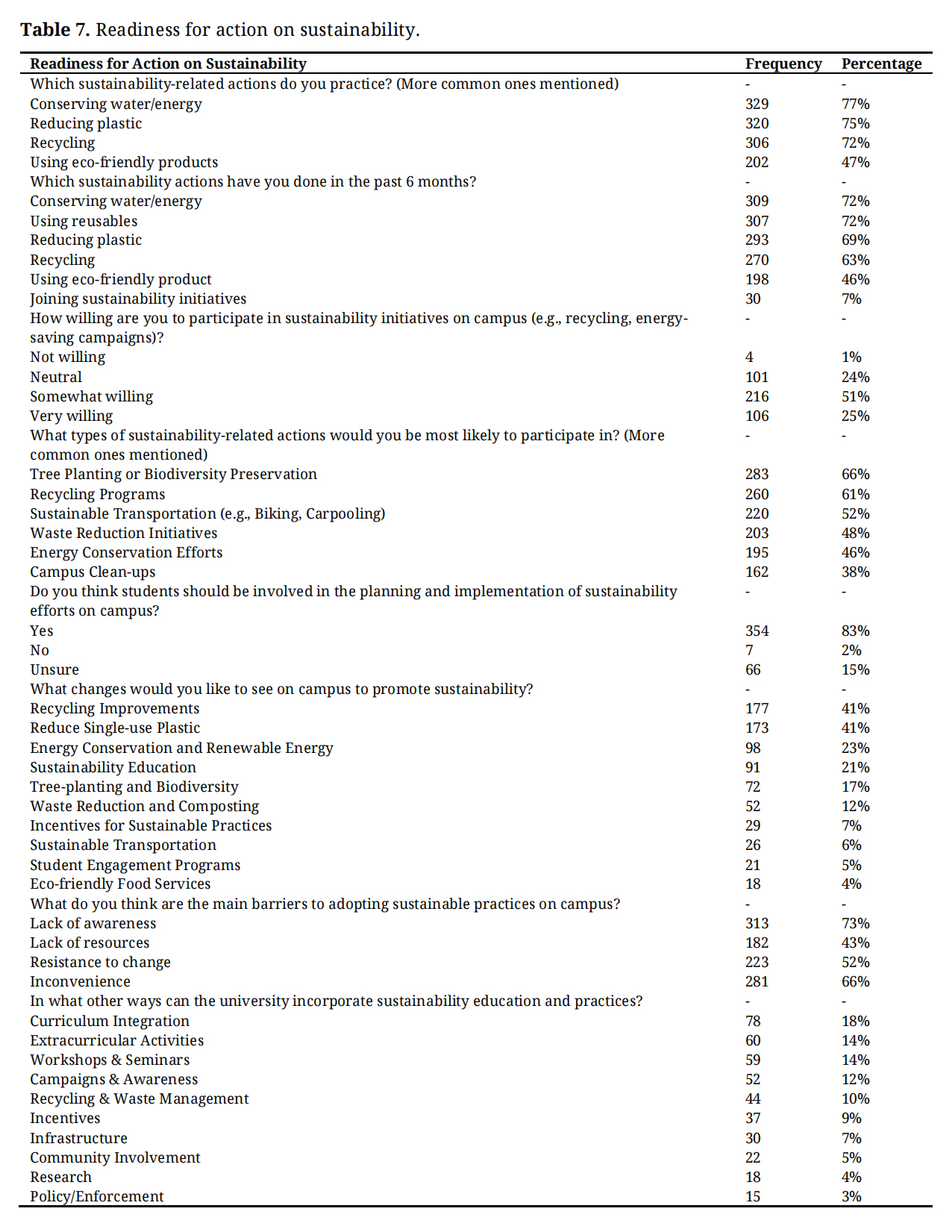 Table 7 indicates the respondents’ readiness for action on sustainability. During the past six months, the most common measures they have undertaken to promote sustainability include conserving water/energy, using reusables, and reducing plastic use. A total of 322 respondents (75.4%) were somewhat or very willing to participate in sustainability initiatives on campuses. Approximately 83% were willing to be involved in sustainability efforts. Tree planting, recycling programs, sustainable transportation, waste reduction initiatives, energy conservation efforts and campus clean-ups were mentioned. Students should be involved in planning and implementing sustainability efforts on campuses. Improvement in recycling, reducing the use of single-use plastic, and energy conservation for fostering sustainability on campuses were mentioned. The main barriers to the adoption of sustainable practices on campuses were the lack of awareness, inconvenience, and resistance to change. Approximately 82% of the respondents expressed that they should be involved in planning and implementing sustainability initiatives on campuses.