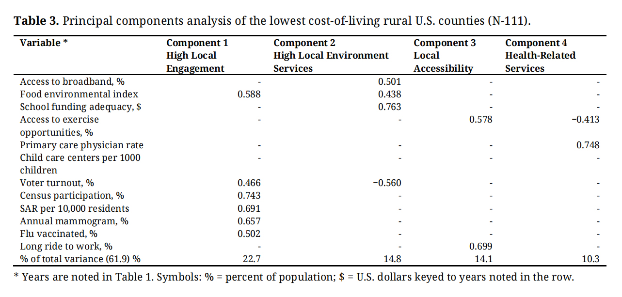Table 3. Principal components analysis of the lowest cost-of-living rural U.S. counties (N-111).