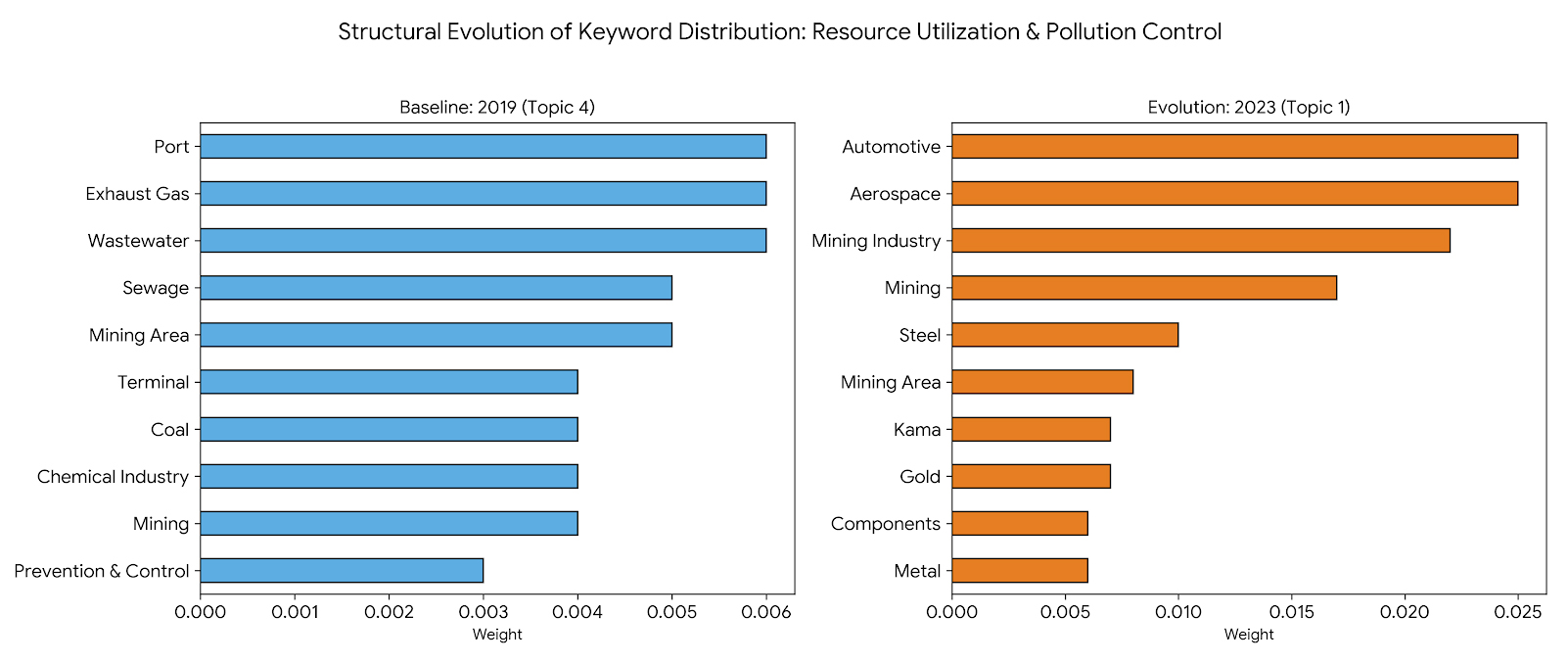 From the perspective of topic evolution, lineage 4 Resource Utilization & Pollution Control presents the highest degree of structural instability among all identified themes (see Figure 11). The topic of 2019 in this lineage was basically featured by terms reacting to pollution, which were, but not limited to, “wastewater (废水),” “exhaust gas (废气),” and “prevention and control (防治).” To further understand it, a high probability keywords distribution like this indicates a focus on end-of-pipe environmental management. Across the study period, keywords related to traditional resource-intensive and high-pollution industries, such as “mining areas (矿区),” “coal (煤炭),” “chemical industry (化工),” “steel (钢铁),” and “metals (金属)”, emerged recurrently, which suggest a persistent association of lineage 4 with heavy industrial activities.