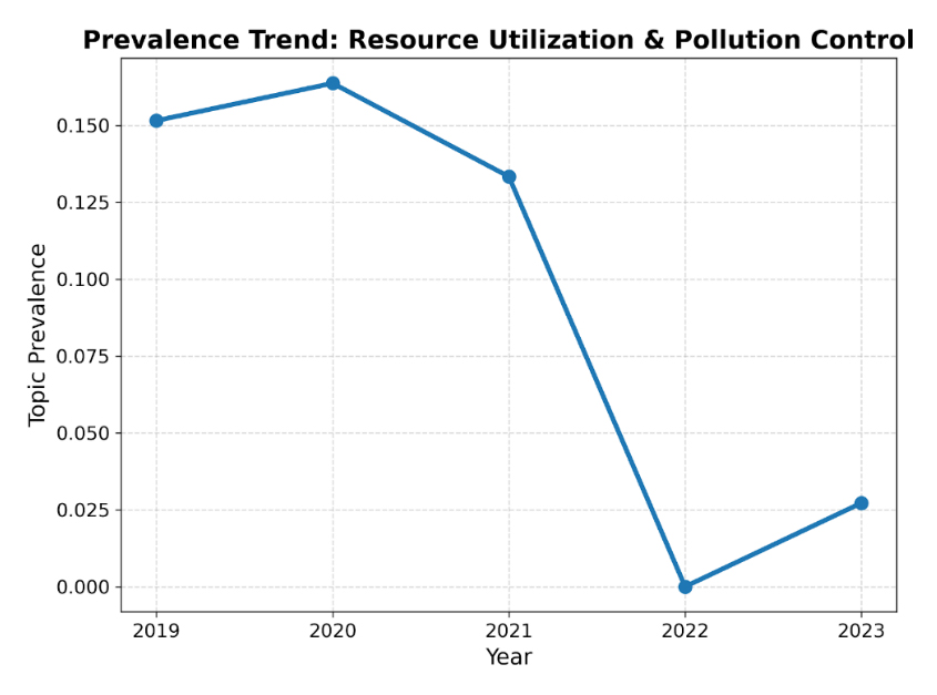 From the perspective of annual prevalence evolution, “Resource Utilization & Pollution Control” lineage shows a significant and continuous decline over the study period (see Figure 12). Its topic prevalence decreased sharply from 0.1515 in 2019 to 0.0272 in 2023, which was the most substantial reduction among all five lineages. Despite minor fluctuations in ongoing years, the overall trend indicates a rapid marginalization of this theme within corporate sustainability disclosures.