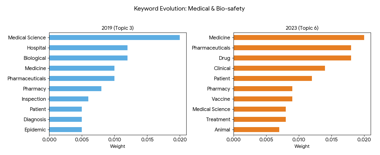 From the perspective of topic evolution, the “Medical & Bio-safety” lineage demonstrates a high level of semantic stability throughout the sample period (see Figure 13). Across all five years, the topic was consistently taken up by sectoral-specific terms including “medicine (医学),” “pharmaceuticals (医药),” “hospitals (医院),” “drugs (药品),” and “patients (患者),” with no substantial changes in the structural distribution. In contrast to other lineages, this theme barely exhibited obvious internal diversification or lexical replacement. The main changes in this lineage were largely confined to pandemic-related terms within the healthcare sector. The term “epidemic (疫情)” appeared with relatively high probability in 2019 and 2020, while “vaccine (疫苗)” remained a prominent term from 2019 to 2022. By 2023, although the core medical vocabulary remained stable, pandemic-specific terms no longer appeared among the high-probability keywords, indicating a convergence toward routine medical and healthcare-related disclosures.