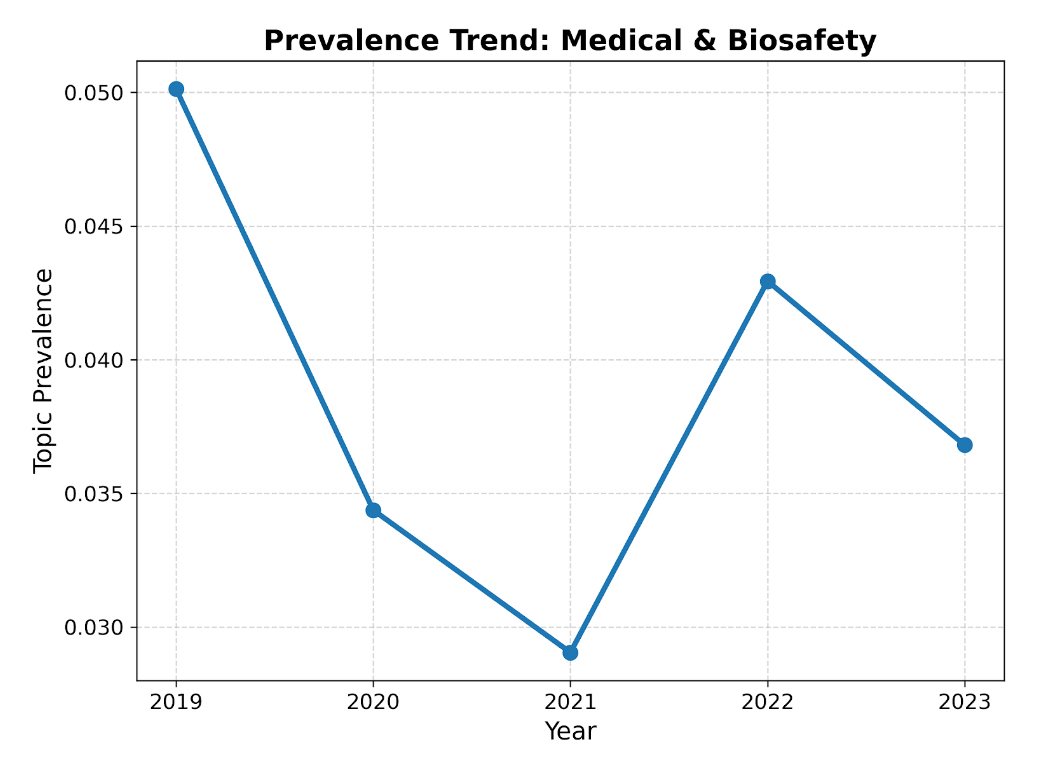 From the perspective of annual prevalence evolution, the “Medical & Bio-safety” lineage sees a gradual declining trend over the study period (see Figure 14). Its topic prevalence decreased from 0.0501 in 2019 to 0.0368 in 2023. In spite of minor fluctuations across years, the overall decline suggests a relative reduction in the narrative weight of this theme within corporate sustainability disclosures.