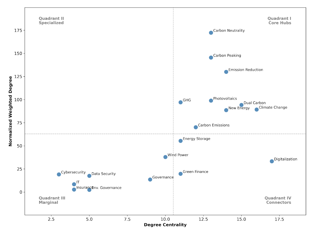 Third, the structural integration of corporate disclosure was strengthened through the growing role of digitalization and governance-related concepts. Co-occurrence network analysis reveals that “Dual Carbon” and “New Energy” functioned as central hubs, while keywords such as “Digitalization” and “Governance” acted as key connectors linking climate strategy, technological pathways, and managerial frameworks. This suggests that digital infrastructure and governance mechanisms have become closely integrated components for organizing and legitimizing climate-oriented disclosure.