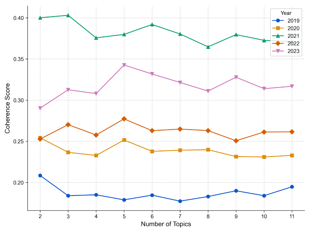 Evolution of Corporate Sustainability Disclosure Topics Thematic Identification and DefinitionBefore topic interpretation, the optimal number of topics for each year was determined using coherence score analysis across a range of K (2 to 11) values (see Figure 3). While lower values of K exhibited slightly higher cross-year stability, K = 7 was selected to balance semantic granularity and interpretability within each year’s sustainable disclosures.