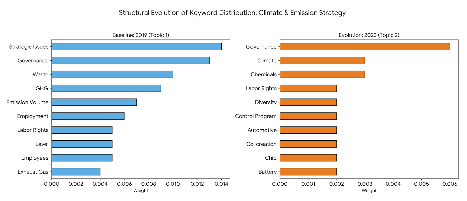 Our primary metric, Document Coverage, is defined as the percentage of total reports in a given year that mention a specific keyword at least once. This metric is chosen over raw word count to effectively normalize for annual variations in sample size and report length. To formally verify the policy's structural impact, a Two-sample Z-test for Proportions was conducted. This test compares the Document Coverage of each keyword in the baseline period (2019) against the post-policy period (2023) to determine if the observed shifts are statistically significant.