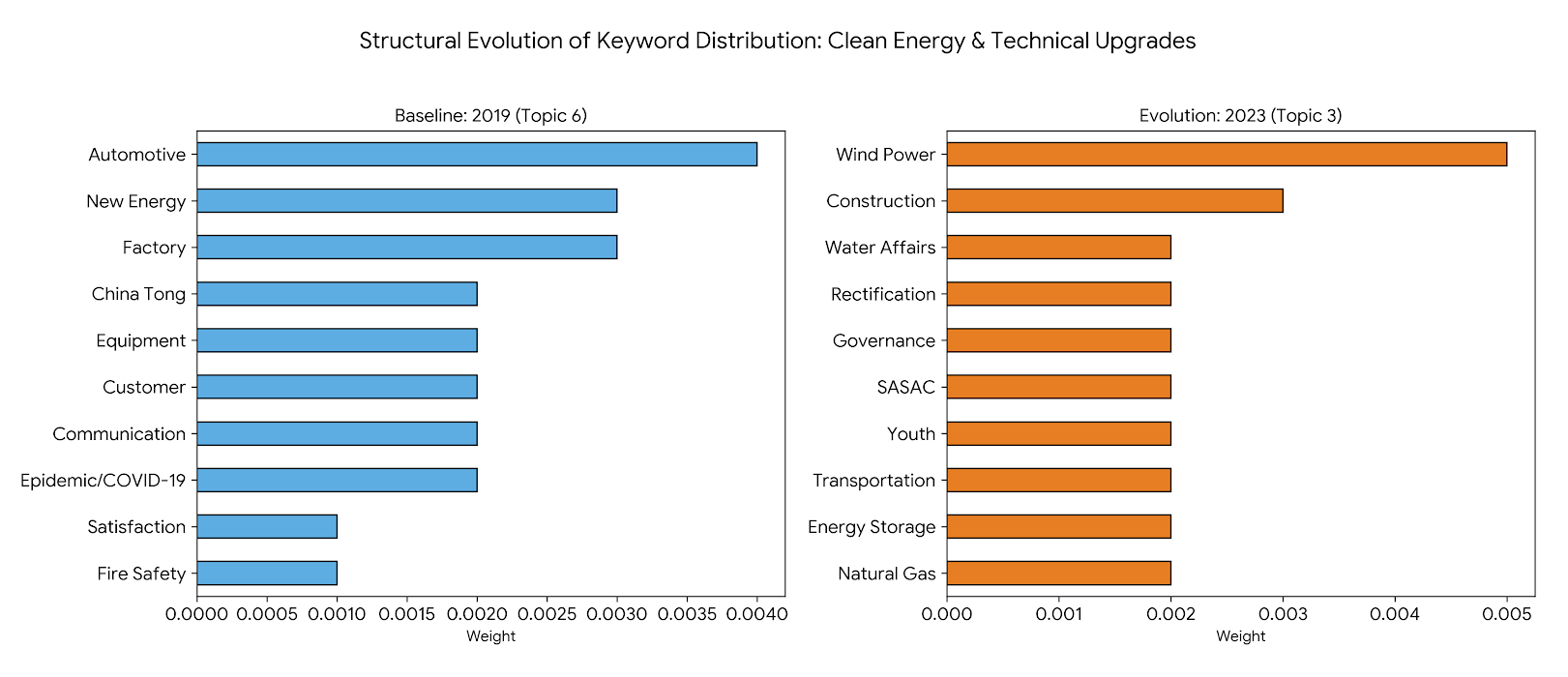 From the perspective of annual prevalence evolution, the “Clean Energy & Technical Upgrades” lineage experienced a significant decline followed by a partial recovery over the study period (see Figure 8). In detail, its topic prevalence decreased from 0.4307 in 2019 to a dramatically lower score of 0.0797 in 2021, but rebounded to 0.2376 in 2023. Overall, this trend reflects a substantial reduction in the relative narrative weight of this lineage compared with its initial prominence in 2019.
