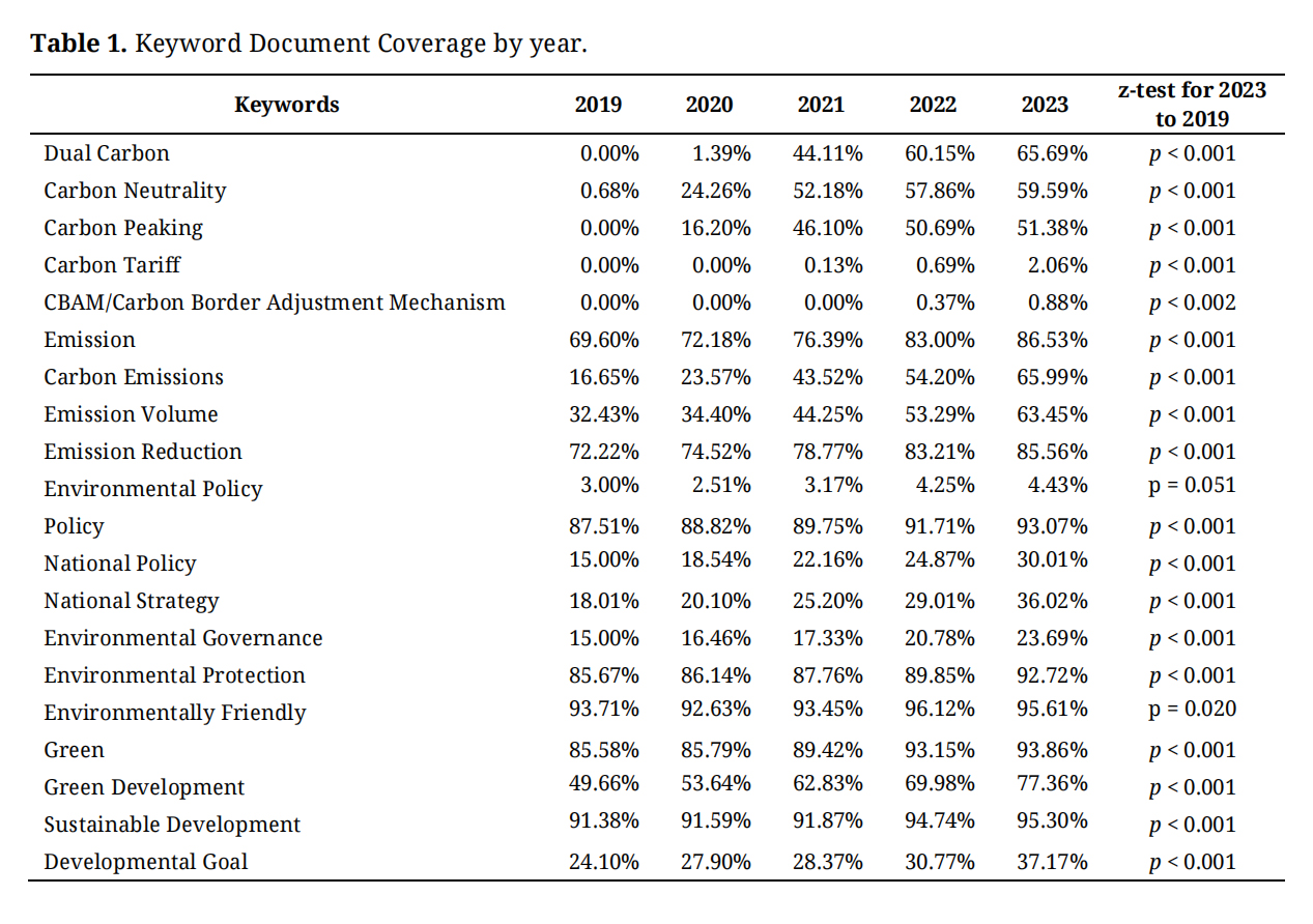 Data Analysis Word Frequency Analysis & Significance TestTo quantify the change in Chinese-listed companies’ focus on the lexical level, we first selected a matrix of 21 policy-relevant keywords derived from the State Council’s "Action Plan for Carbon Dioxide Peaking Before 2030" and the “1+N” policy framework, covering key dimensions such as policy directives (e.g., Dual Carbon, Carbon Neutrality), action indicators (e.g., Carbon Emissions, Emission Reduction), and generalized sustainability terms (e.g., Green Development). The full of 21 keywords are: “Dual Carbon (双碳)”, “Carbon Neutrality (碳中和)”, “Carbon Peaking (碳达峰)”, “Carbon Tariff(碳关税)”, “CBAM”, “Carbon Border Adjustment Mechanism(碳边境调节机制)”, “Emission(排放)”, “Carbon Emissions(碳排放)”, “Emission Volume(排放量)”, “Emission Reduction (减排)”, "Environmental Policy(环境政策)”, “Policy (政策)”, “National Policy(国家政策),” “National Strategy(国家战略)”, “Environmental Governance(环境治理)”, “Environmental Protection (环境保护)”, “Environmentally Friendly (环保)”, “Green (绿色)”, “Green Development (绿色发展)”, “Sustainable Development(可持续发展)”, and "Developmental Goal(发展目标)".