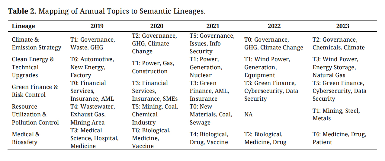 Adopting the optimal topic number k = 7 and individually modeling each year’s sustainable disclosures from 2019 to 2023, a total of 35 latent topics (7 topics per year) was generated. To enhance interpretability and enable cross-year comparison, these topics were categorized based on the semantic similarity of their high probability keywords and dominant thematic content. Consequently, five recurrent thematic lineages were identified, which collectively represent recurring thematic patterns in corporate sustainability narratives in China. These five lineages are: Climate & Emission Strategy, Clean Energy & Technical Upgrades, Green Finance & Risk Control, Resource Utilization & Pollution Control, and Medical & Bio-safety.