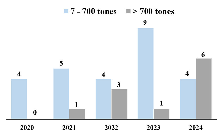 Figure 2. Number of oil spills from tankers since 2020 [5].