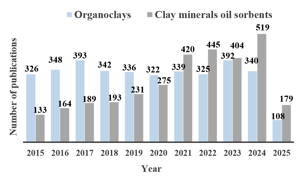 Currently, the possibilities of using organoclays in environmental conservation practices are being actively studied based on their structure and properties, sorption capacity and the strength of binding pollutants. Additionally, there is an increase in publications related to the optimization of synthesis methods and the selection of the best modifiers, as well as methods of their application, as evidenced by the increase in the number of publications in the database Sciencedirect by keywords “Organoclays” и “Clay minerals oil sorbents” (Figure 4).