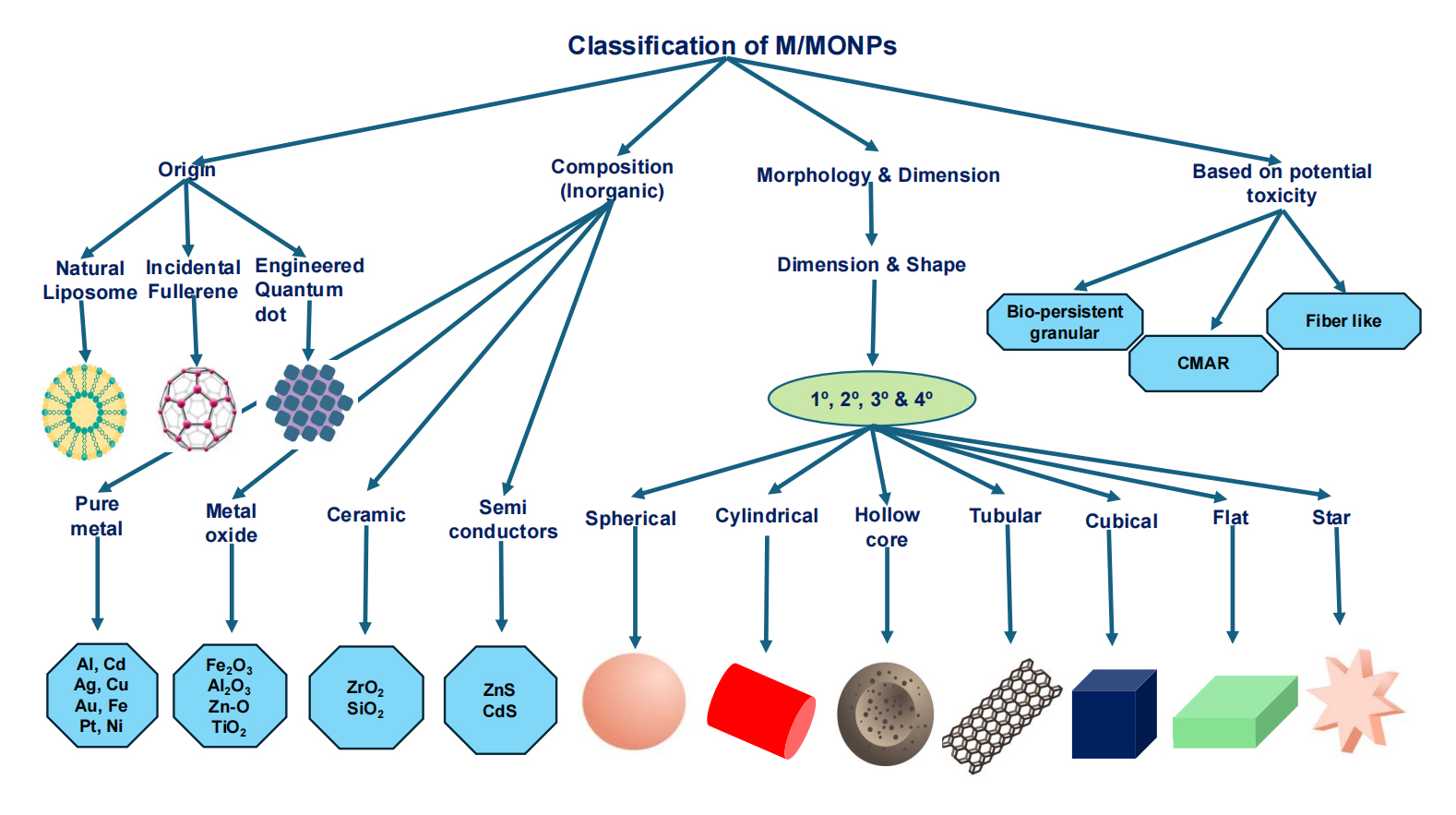 Particles having sizes roughly between 1 and 100 nm in any dimension are classified as nanomaterial [1]. Over the past three decades, researchers have increasingly focused on commercializing nanomaterial-based products due to the exceptional physicochemical properties of various metal and metal oxide nanoparticles (M/MONPs) compared to their bulk counterparts. These properties have the potential to benefit a wide range of sectors, including energy, electronics, construction, food preservation, agriculture, cosmetics, biomedicine, and pharmaceuticals, thereby driving industrial growth and fostering start-up opportunities in the modern era [2].