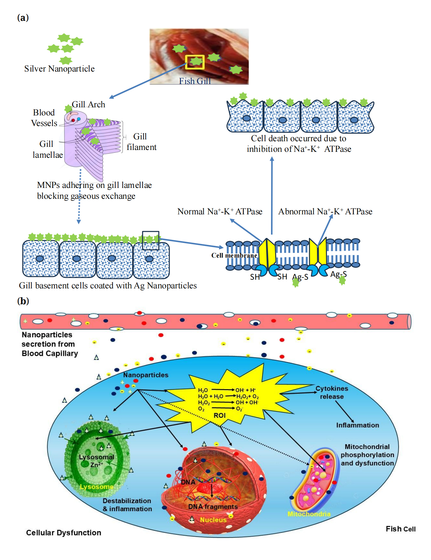 Figure 5. Toxicodynamics of MNPs at organ, cellular and embryonic levels. (a) Cellular necrosis of fish gills caused by AgNPs. (b) Toxicity of metal/metal oxide NPs in fish cells.