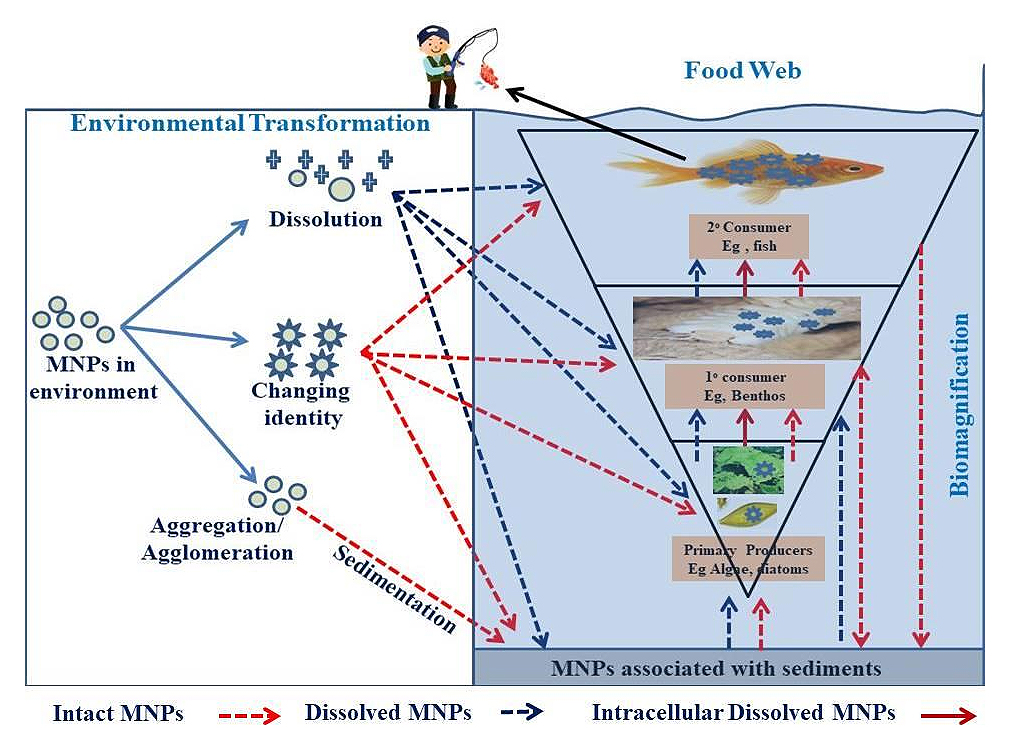 Nanoparticle (NP) accumulation in aquatic ecosystems is higher than in terrestrial ones. It is estimated that approximately 0.4–7% of global NP production is released into water bodies [7]. Other reports indicate that millions of tons of Si, Ti, and Zn-containing nanomaterials ultimately end up in waterways [8]. As a result, aquatic organisms are more affected than terrestrial species due to their greater sensitivity to NP exposure[9]. Ions released from copper oxide, gold, and zinc oxide MNPs disperse readily in aquatic environments, leading to toxicity in biological systems. Numerous studies have highlighted the role of varying MNP concentrations in inducing severe toxic effects in aquatic organisms.