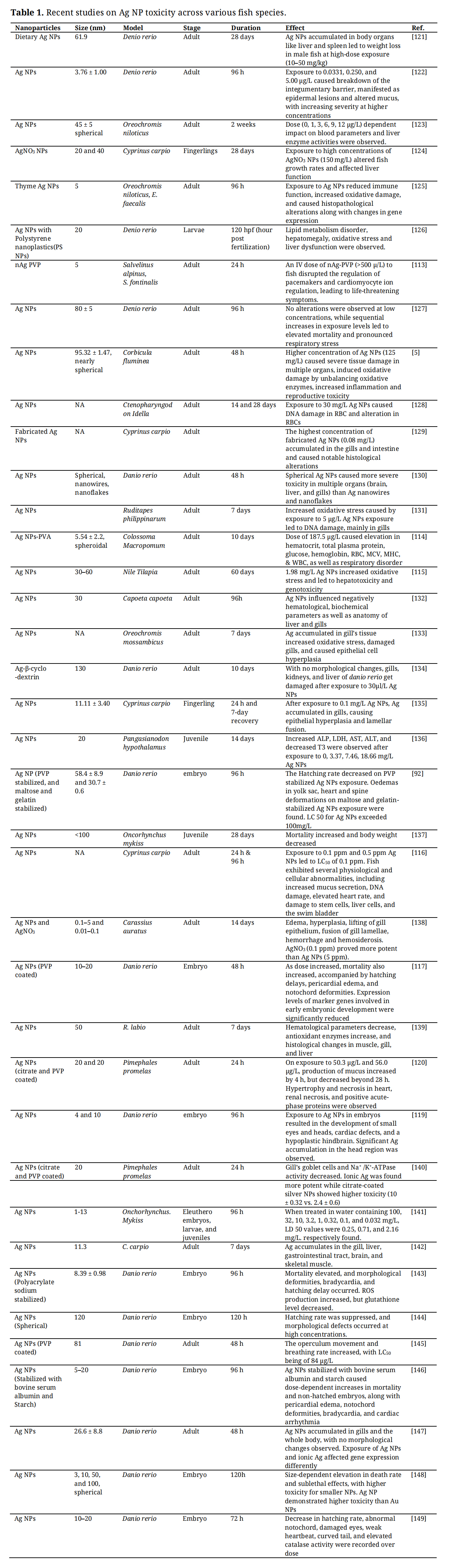 Table 1. Recent studies on Ag NP toxicity across various fish species.