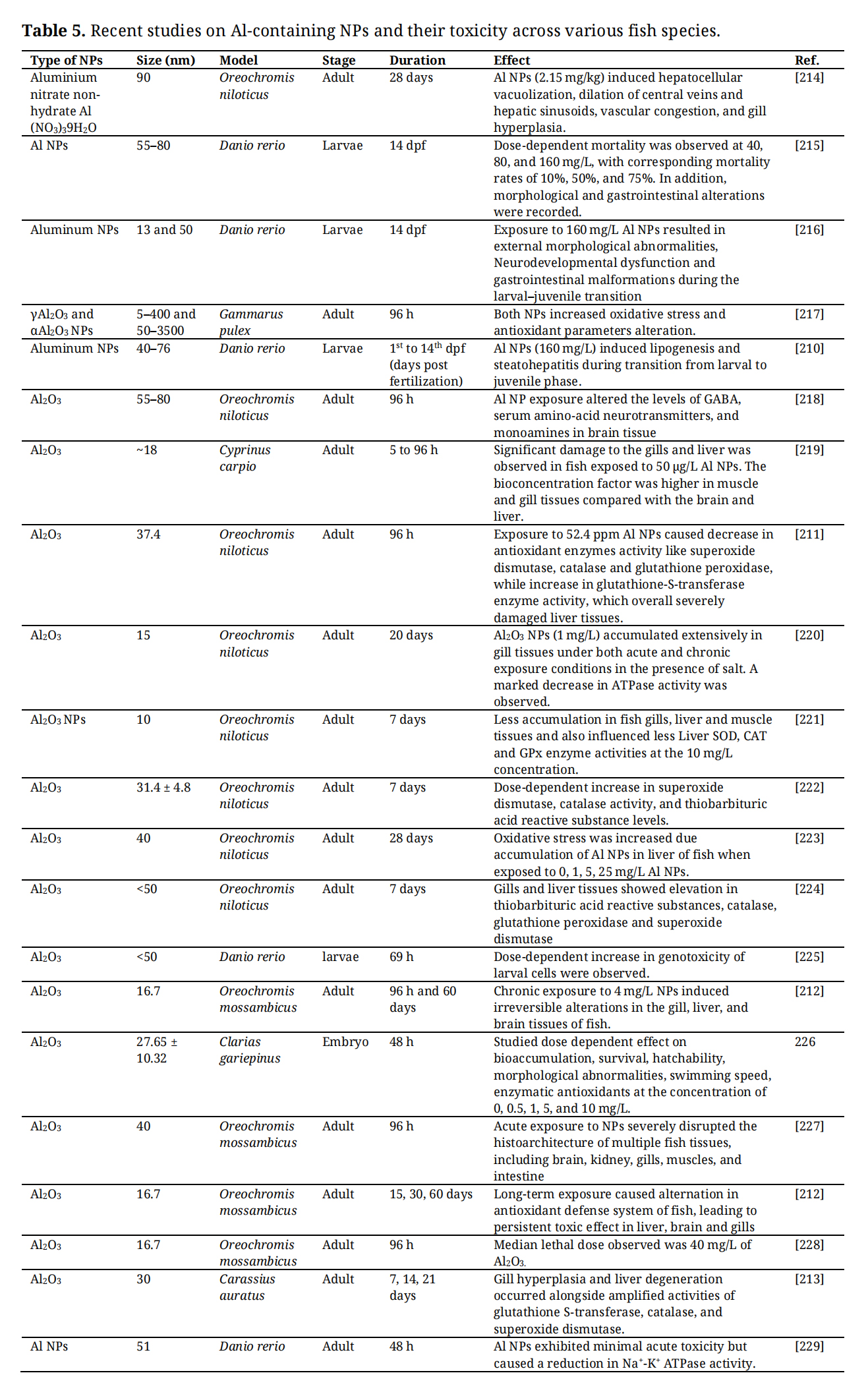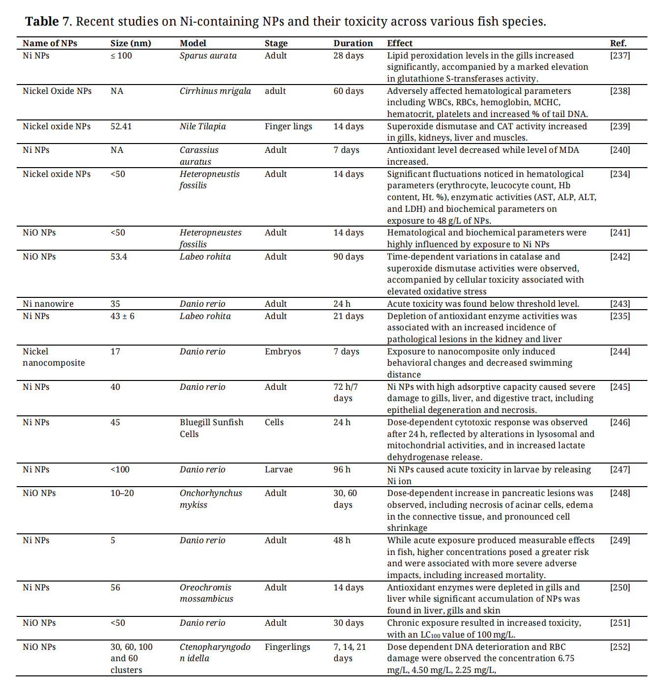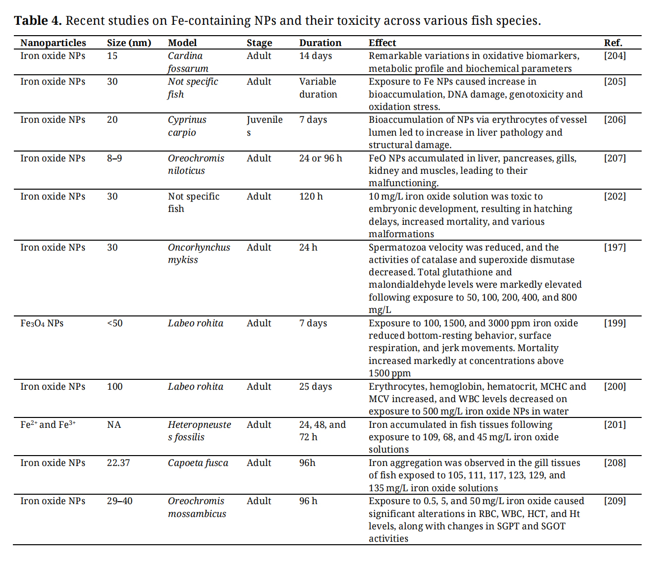 Iron-containing NPs are broadly utilized in medical field like drug delivery, magnetic detection, hyperthermia treatment, and magnetic resonance imaging (MRI), owing to their unique magnetic and physicochemical properties [107]. Several iron-based oxides are commonly encountered, such as magnetite (Fe3O4), hematite (Fe2O3), wüstite (FeO), and iron oxyhydroxides like goethite (FeOOH). Although their biomedical advantages are well documented, the potential toxicological impacts of these materials on aquatic organisms should not be overlooked. Several studies reporting toxicity of above-mentioned respective NPs to aquatic ecosystem are listed in Table 4.
