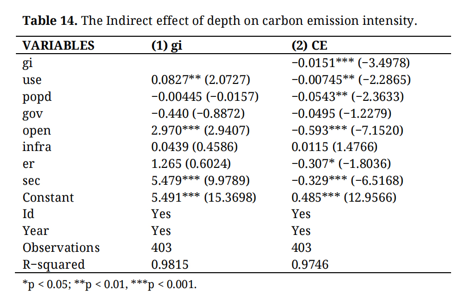 Table 14. The Indirect effect of depth on carbon emission intensity.