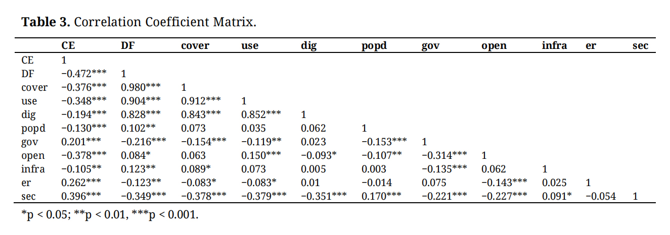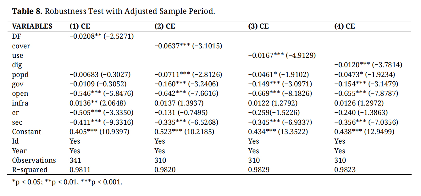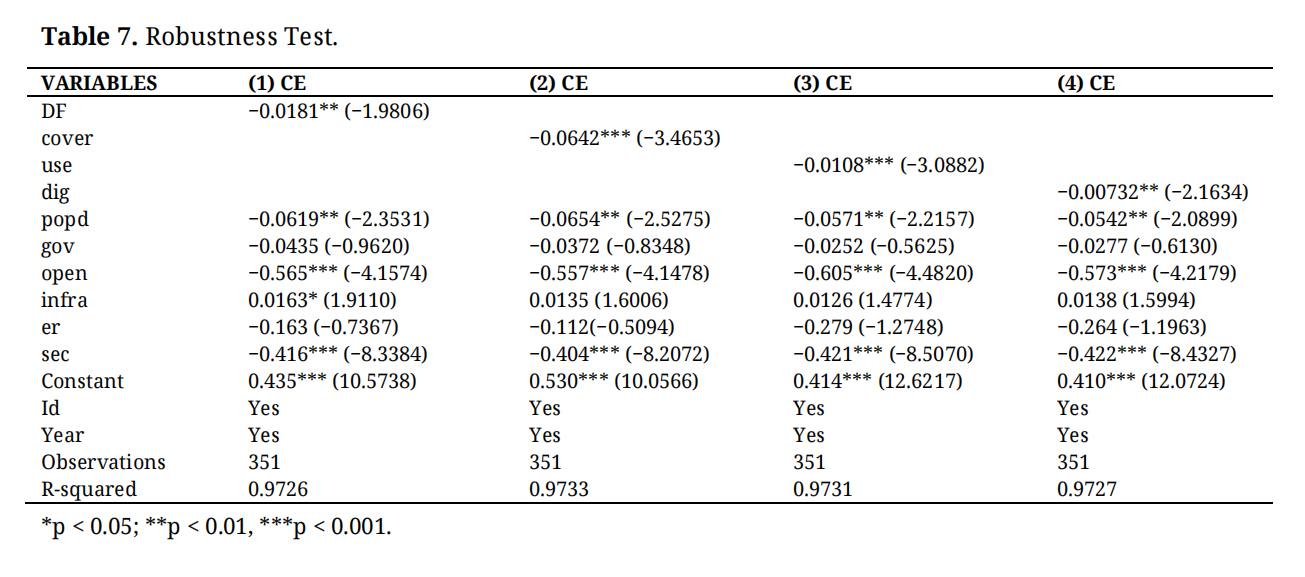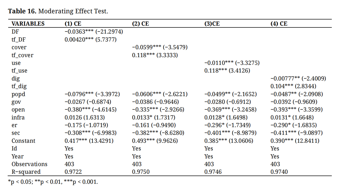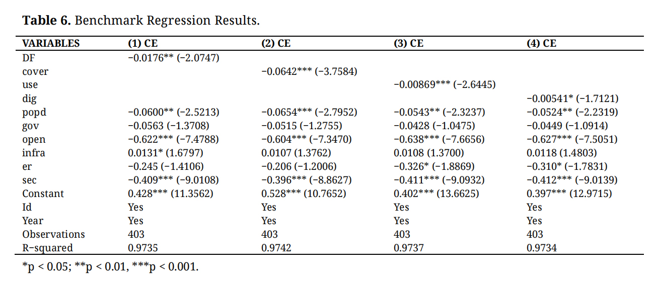 In the regression framework, CEI is the dependent variable, DF is the core explanatory variable, GTI is the mediating variable, and TFS is the moderating variable. Control variables include population density, government intervention, foreign trade, environmental regulation, infrastructure development, and secondary industry development. The estimation proceeds stepwise, beginning with a baseline model without controls and then progressively adding control variables to examine the robustness of the effects on CEI.