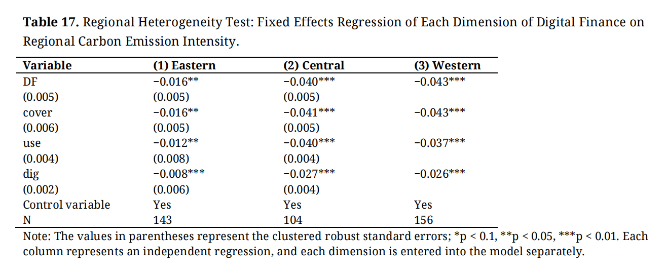 Table 17. Regional Heterogeneity Test: Fixed Effects Regression of Each Dimension of Digital Finance on Regional Carbon Emission Intensity.