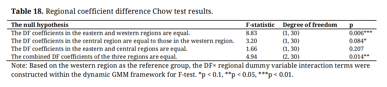 To formally verify the statistical significance of the regional differences, this paper further constructs the interaction term of DF and regional dummy variables and conducts the Chow test. The results are shown in Table 18. The difference test of DF coefficients between the eastern and western regions has F(1, 30) = 8.83 (p = 0.006), the difference test of DF coefficients between the central and western regions has F(1, 30) = 3.20 (p = 0.084), and the joint difference test of the three regions has F(2, 30) = 4.94 (p = 0.014), all of which reject the null hypothesis of equal coefficients at the 10% significance level, and the regional heterogeneity conclusion is empirically supported.