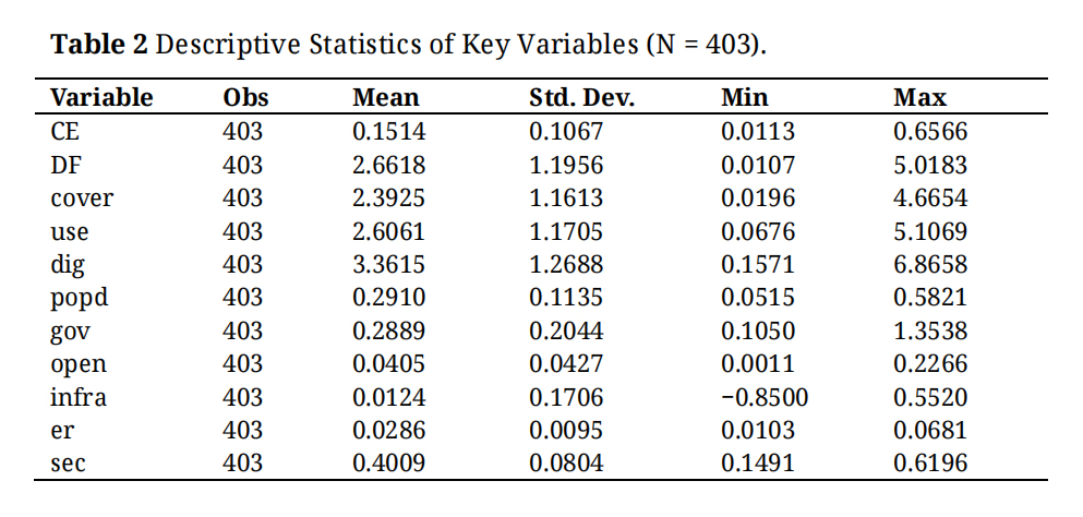 Prior to estimation, data were standardized and descriptive statistics were calculated to examine distributional characteristics. Panel stationarity was tested using both ADF and KPSS tests. Non-stationary variables were transformed through first-order differencing, logarithmic transformation, or detrending when necessary.